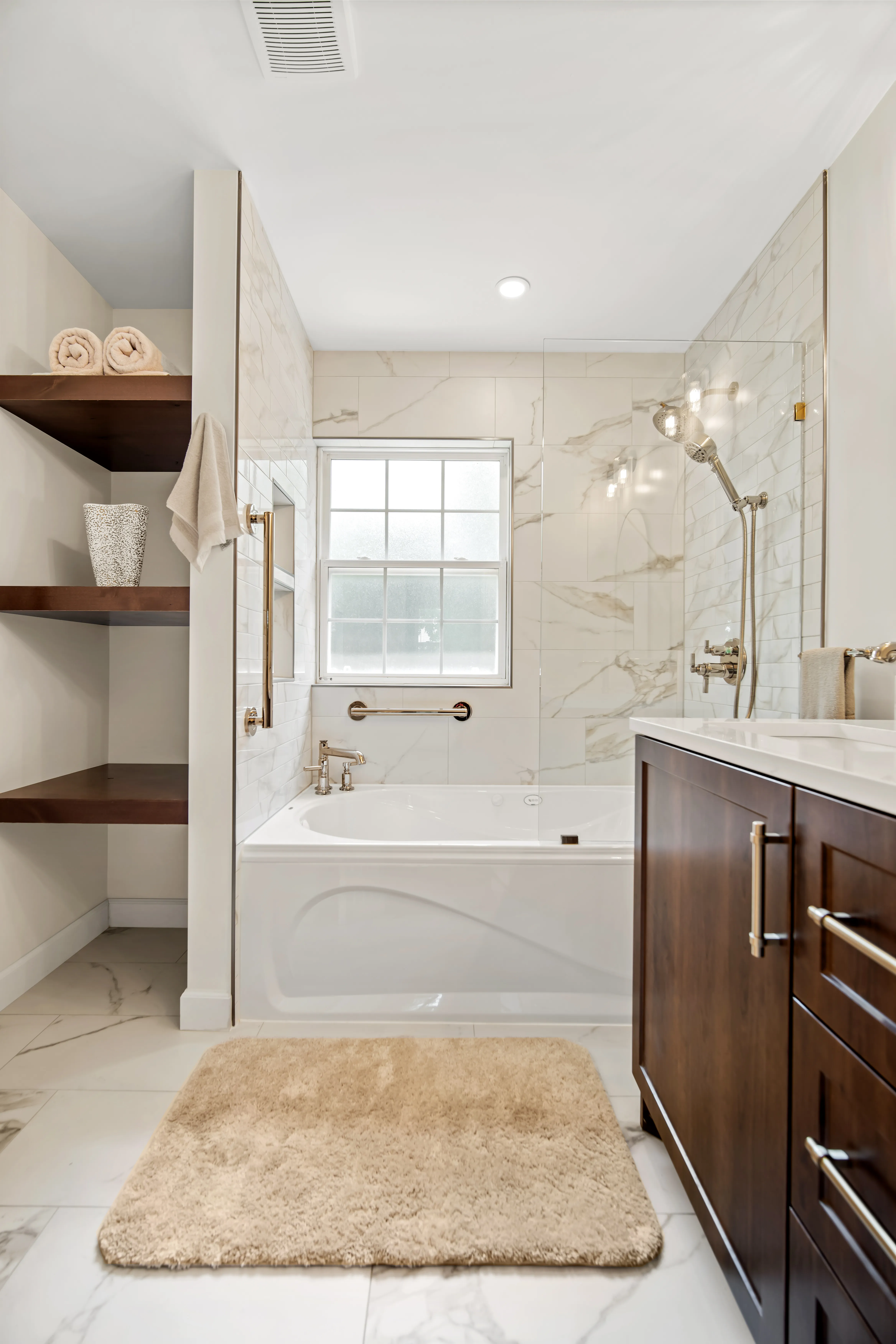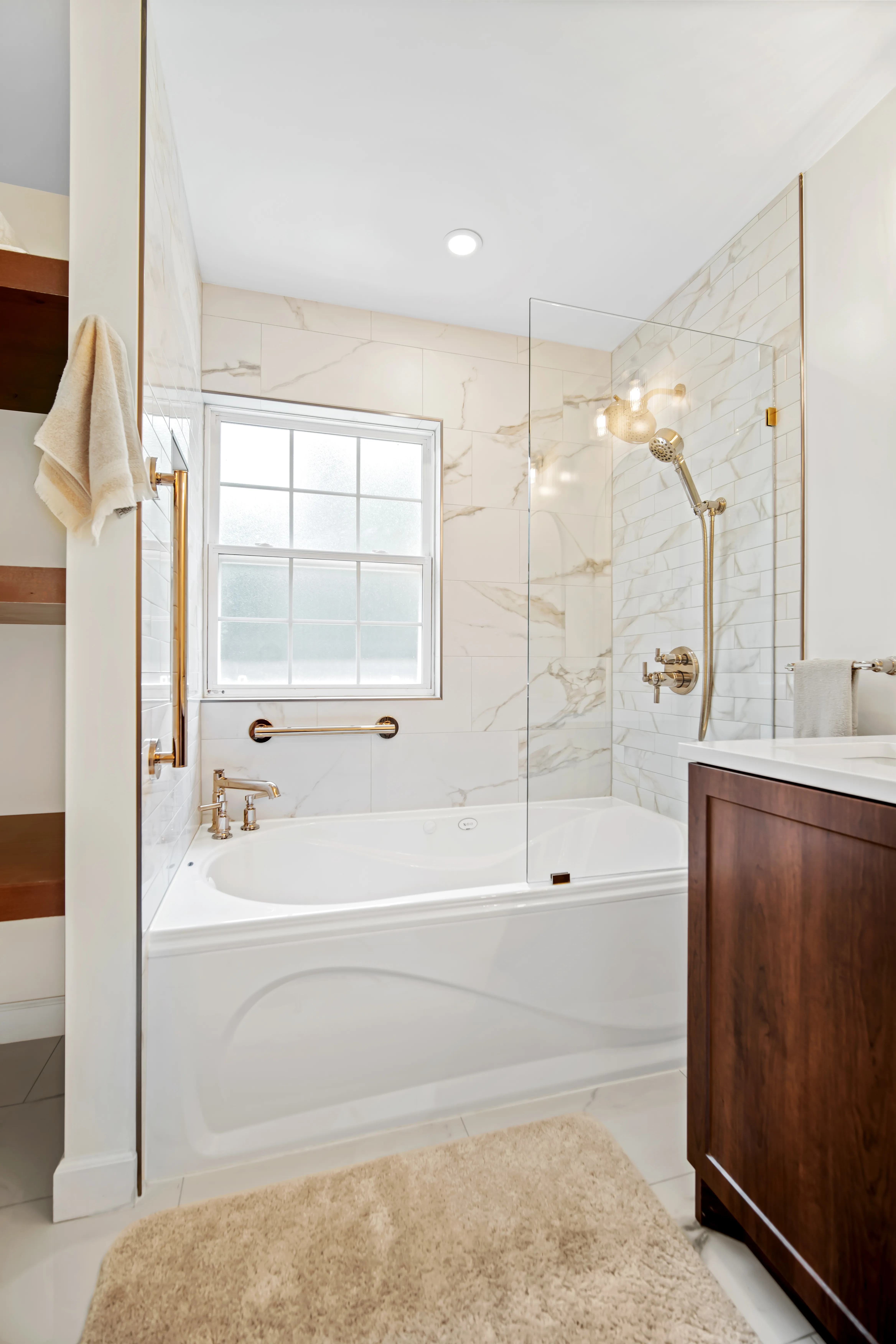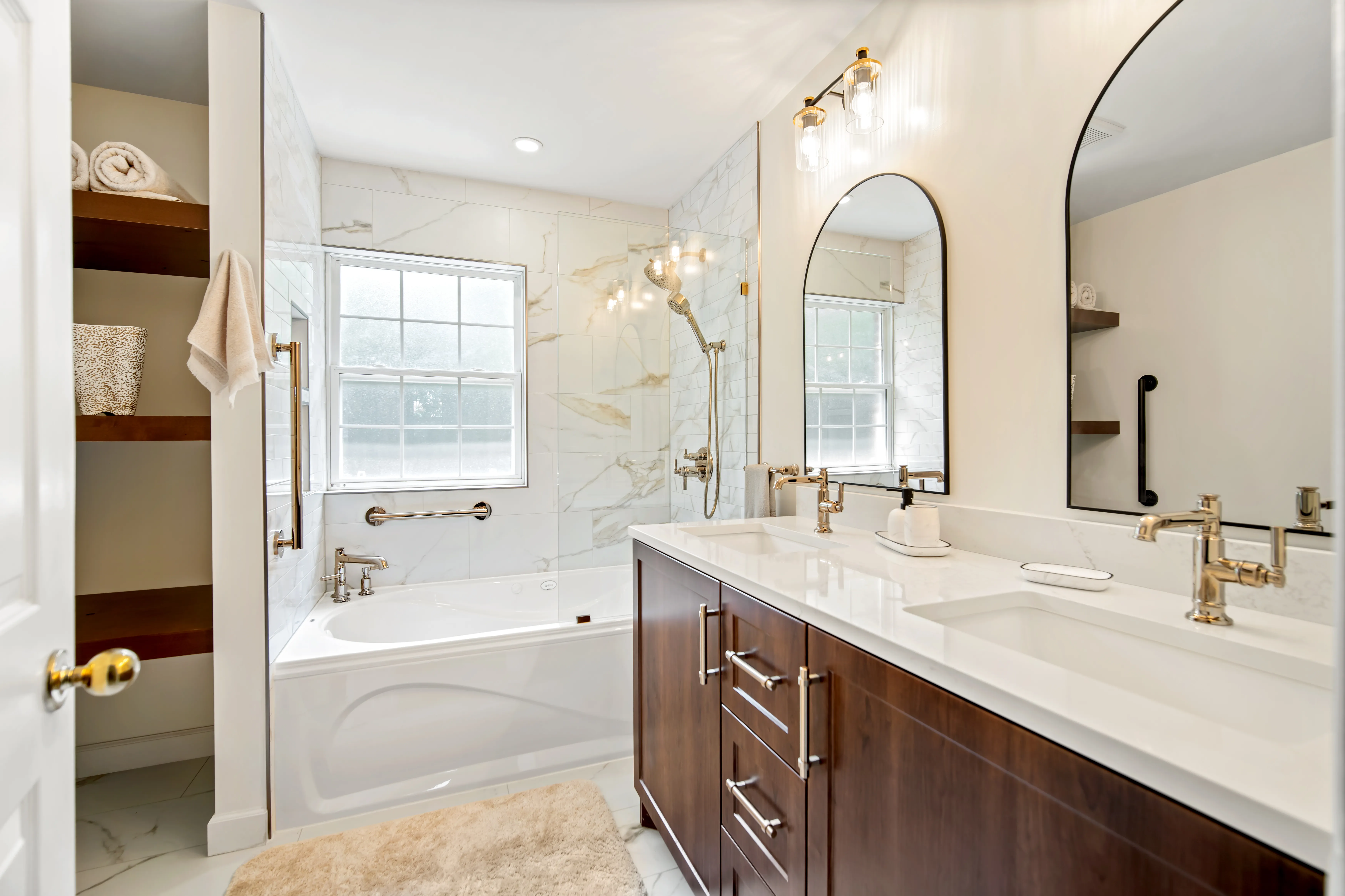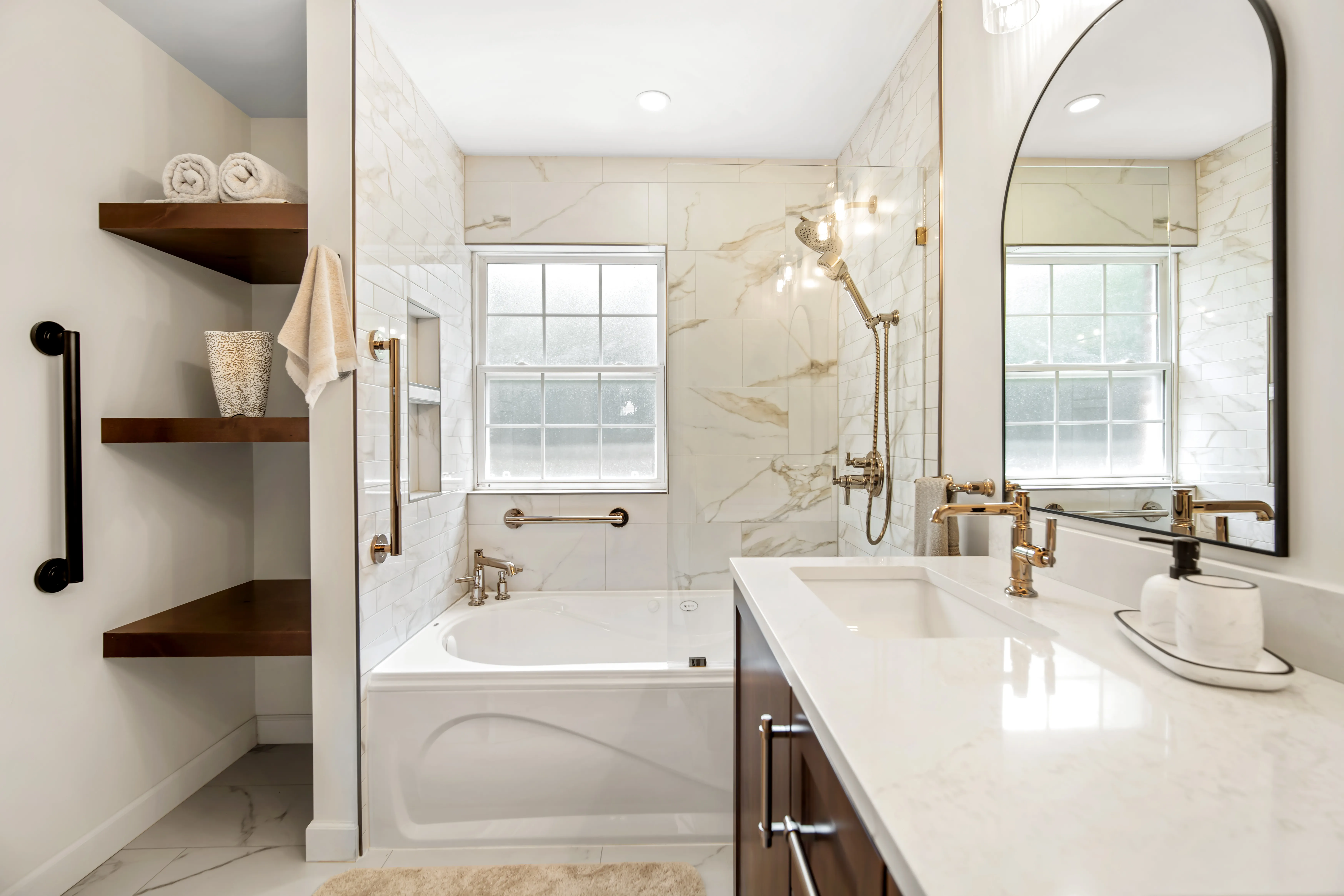 This complete ensuite renovation in Bedford, Nova Scotia, reimagined a dated bathroom into a luxurious and highly functional retreat. The project focused on modernizing the aesthetic while significantly improving the layout and amenities to better suit the homeowners' needs within the Halifax area. The original space featured an aging acrylic whirlpool tub and a separate bidet that no longer served the client's lifestyle. Structural and installation issues were also present, including a tub skirt that was beginning to detach at the sides, requiring a secure, long-term fixation solution to ensure durability.
