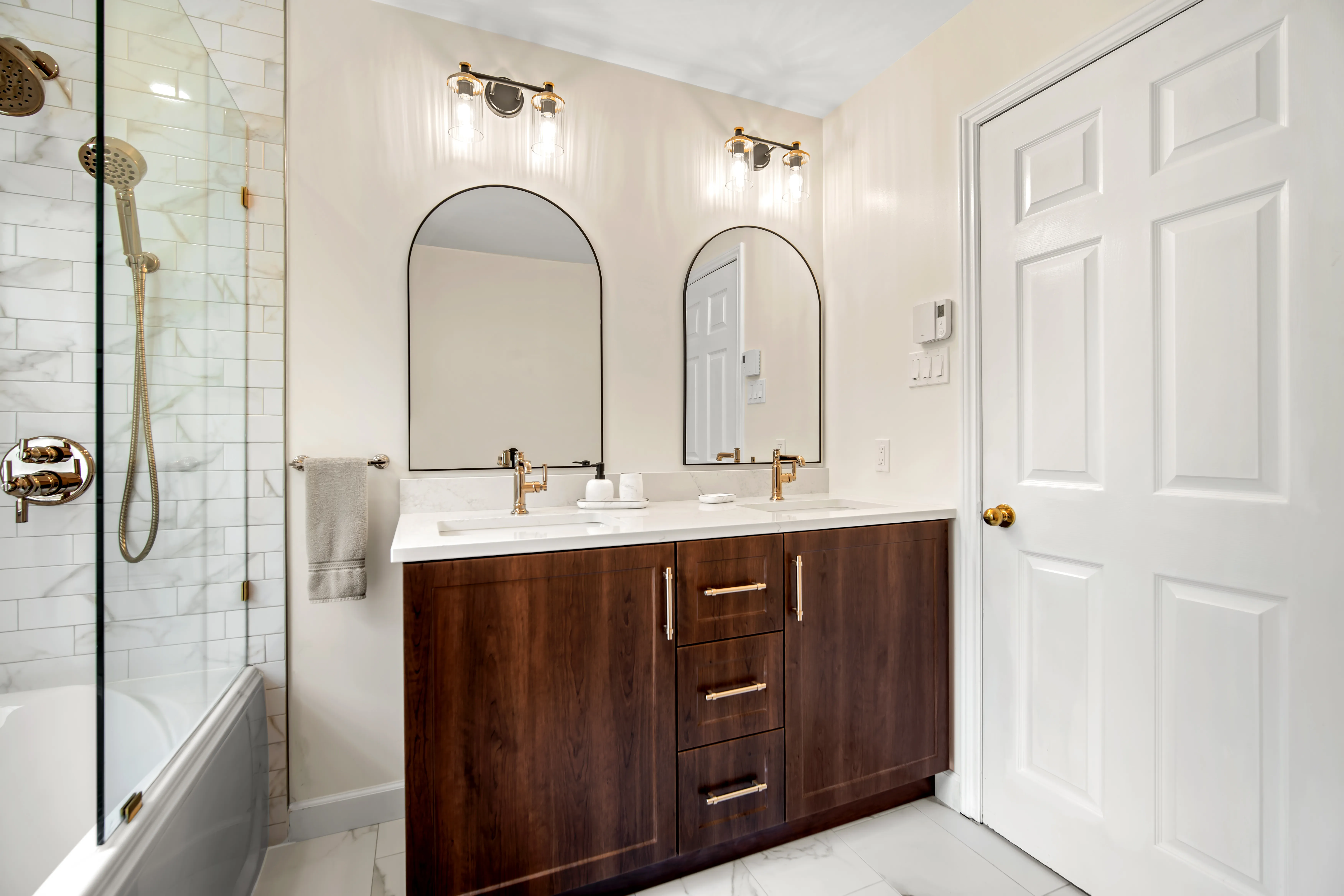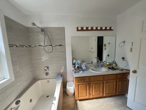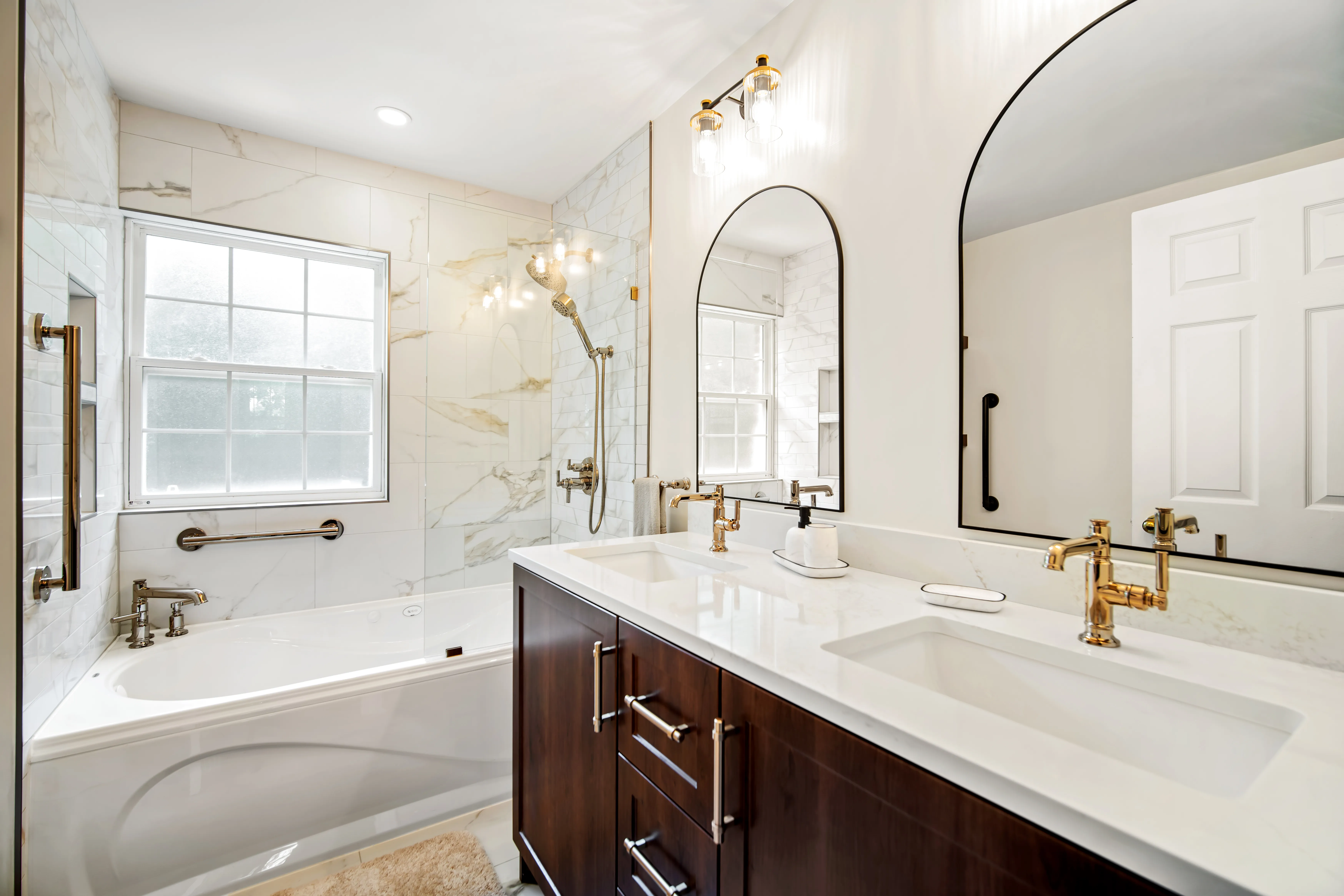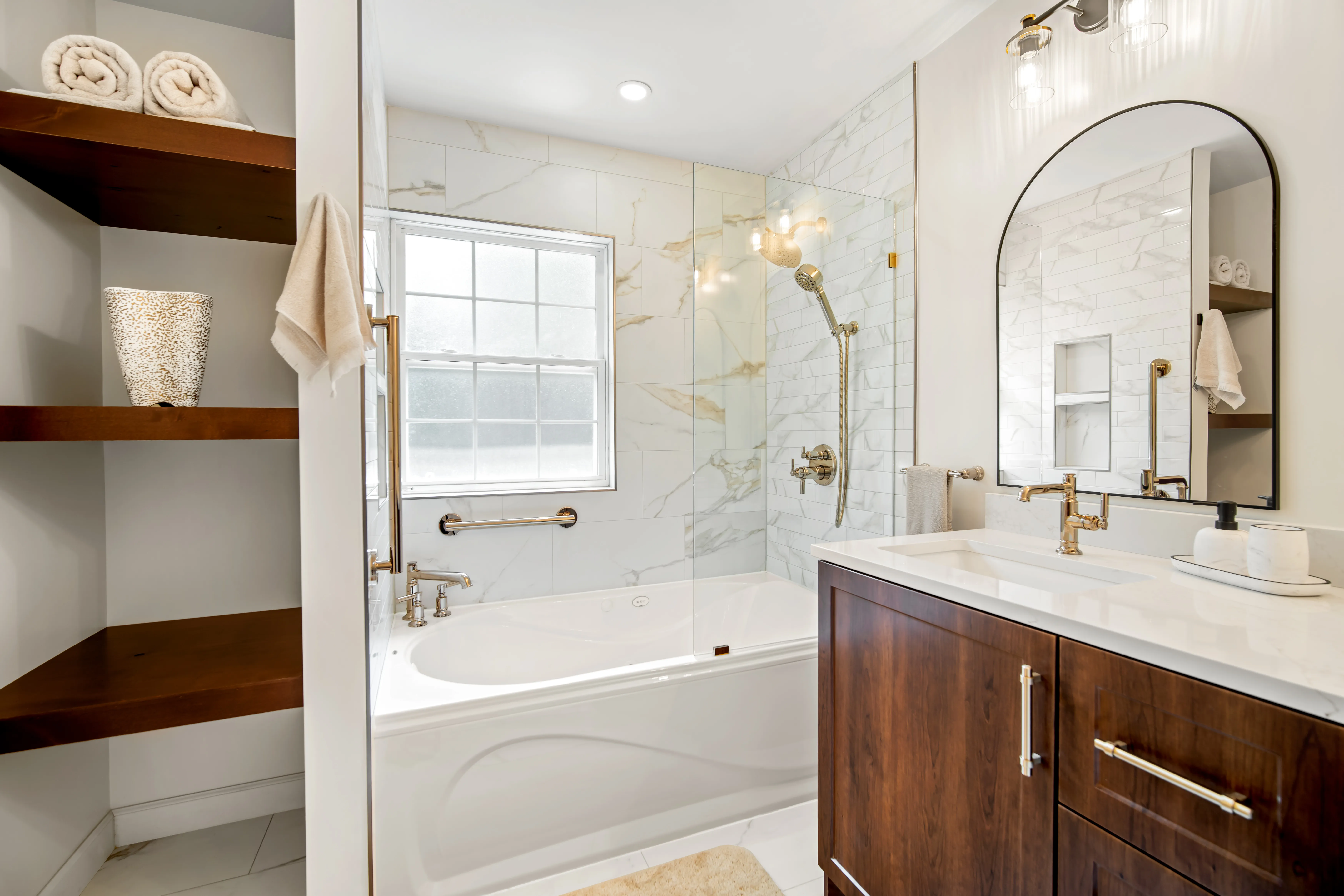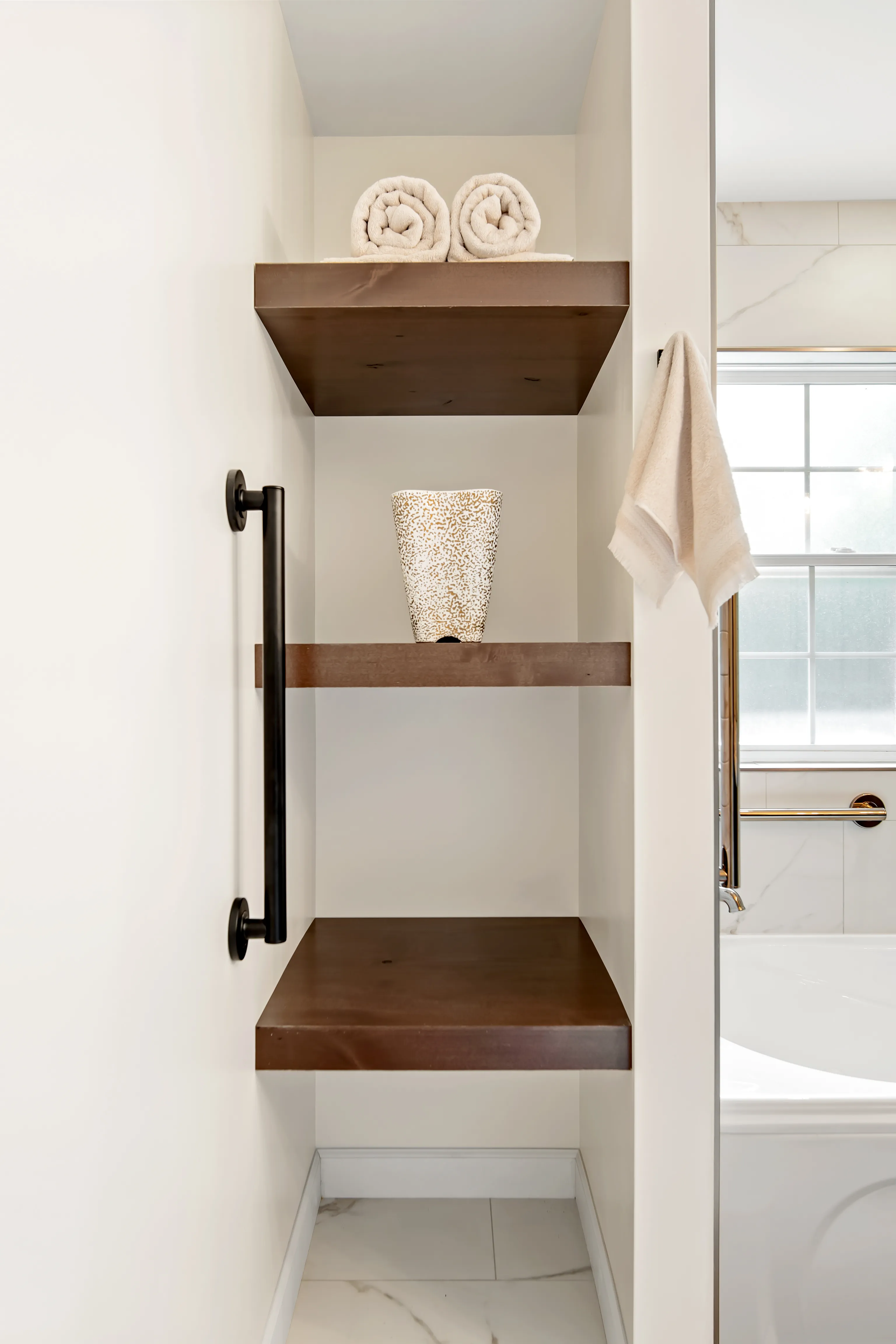 This complete ensuite renovation in Bedford, Nova Scotia, reimagined a dated bathroom into a luxurious and highly functional retreat. The project focused on modernizing the aesthetic while significantly improving the layout and amenities to better suit the homeowners' needs within the Halifax area. The original space featured an aging acrylic whirlpool tub and a separate bidet that no longer served the client's lifestyle. Structural and installation issues were also present, including a tub skirt that was beginning to detach at the sides, requiring a secure, long-term fixation solution to ensure durability.