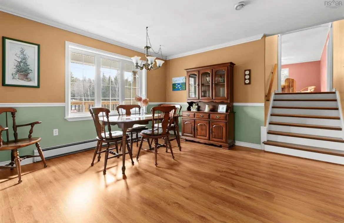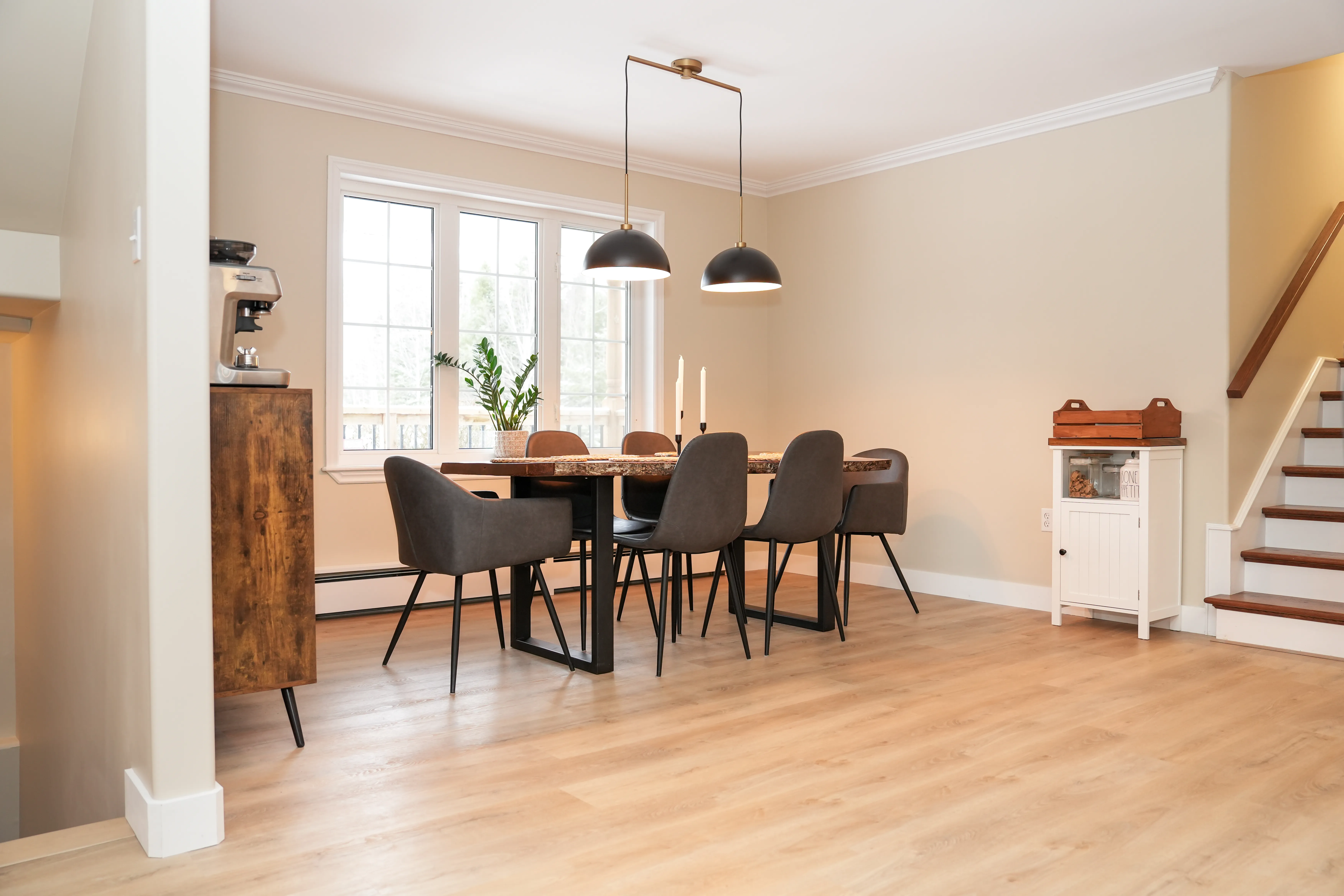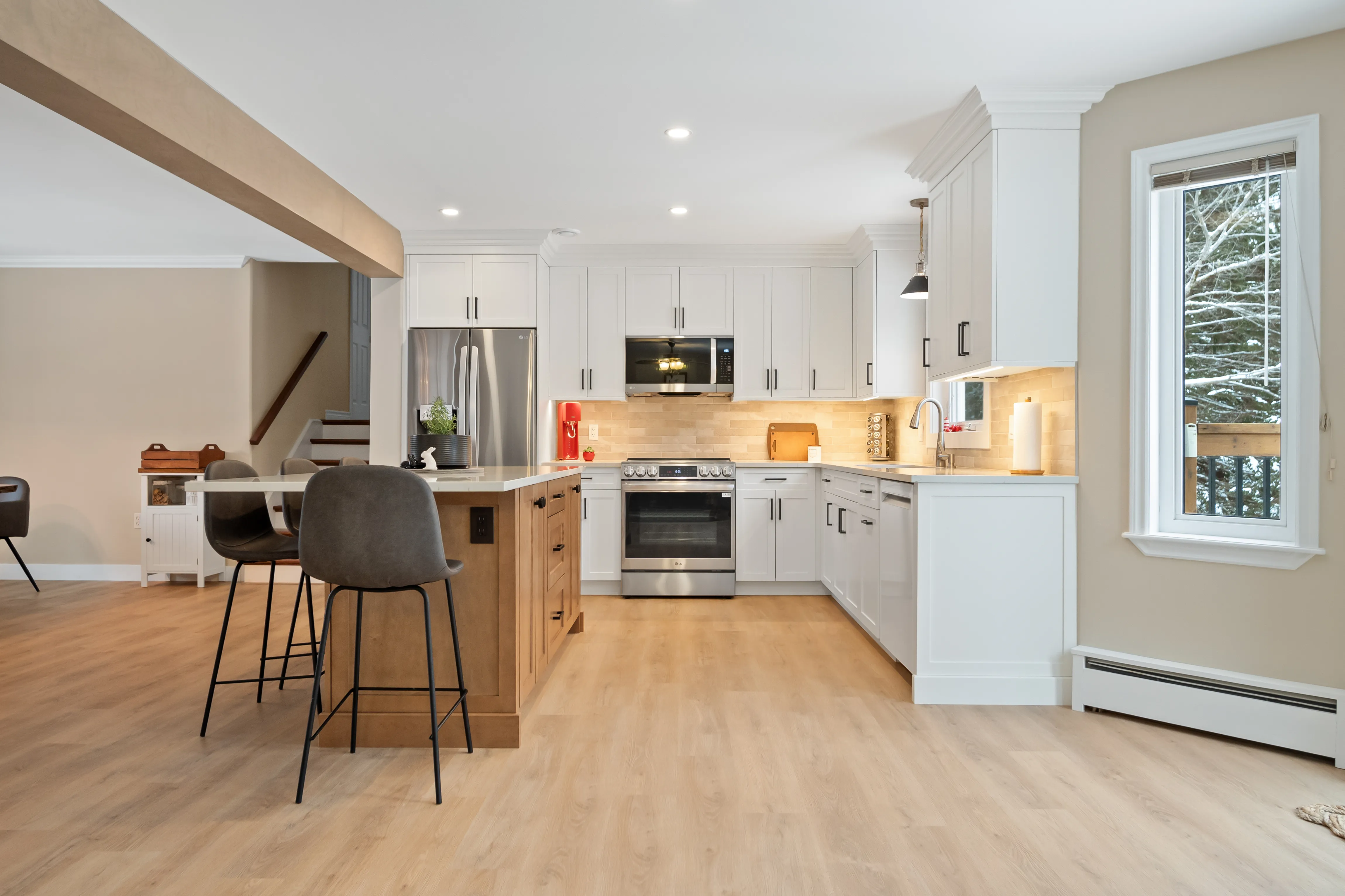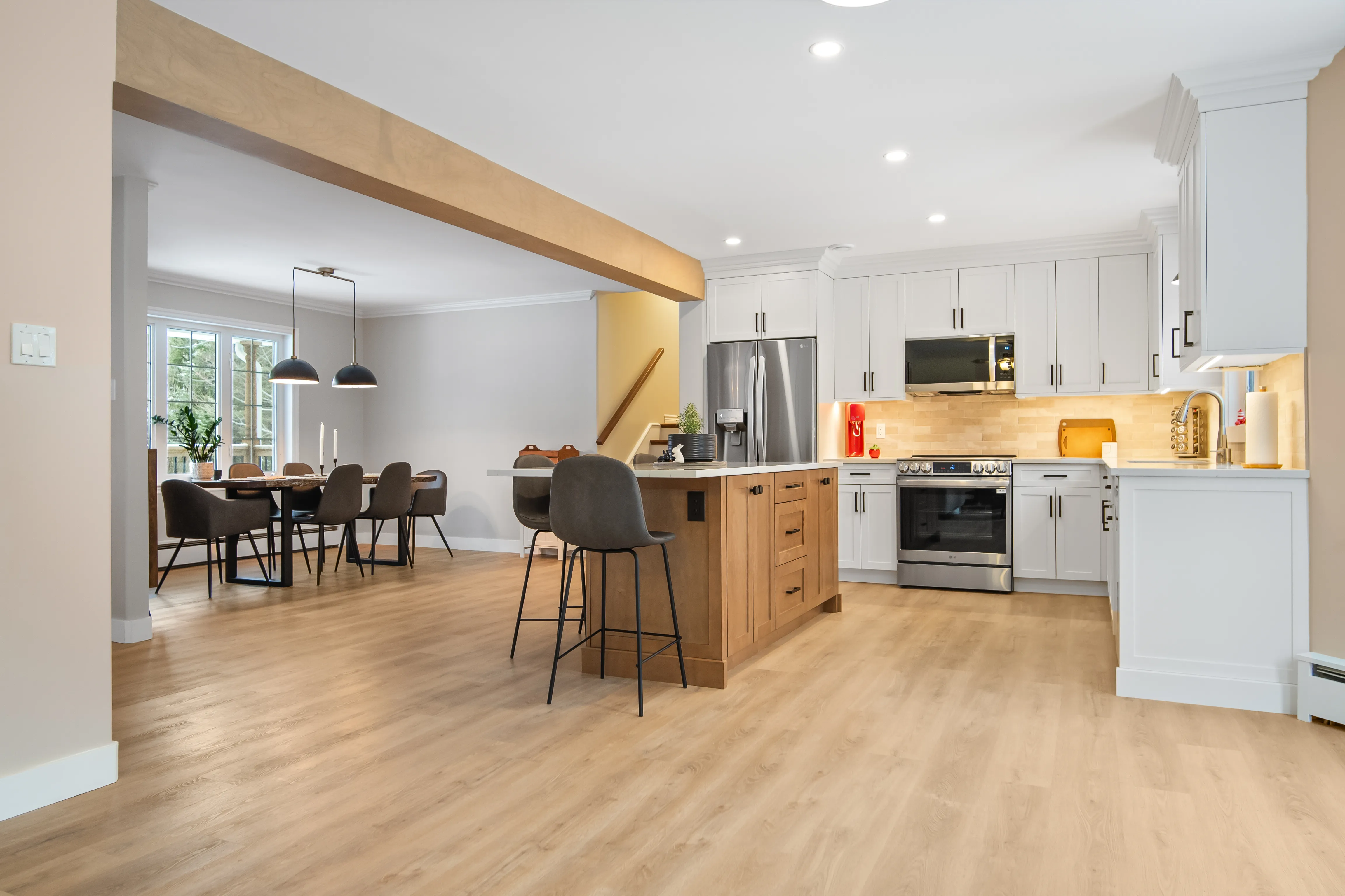 This project revitalized a home in Hammonds Plains, Nova Scotia, by transforming a dated kitchen and dining area into a bright, open, and highly functional space. The removal of a load-bearing wall dramatically altered the layout, creating a seamless flow between the kitchen and dining room. The relocation of the refrigerator to the back wall, along with the addition of a spacious island and a dedicated coffee bar, significantly enhanced the kitchen's usability. The homeowners now enjoy a modern kitchen featuring white shaker cabinets extending to the ceiling, quartz countertops, and a carefully designed lighting scheme. The transformation is striking, moving from a compartmentalized, dim space with honey-toned oak cabinets and a dark green laminate countertop to a light-filled, unified area.