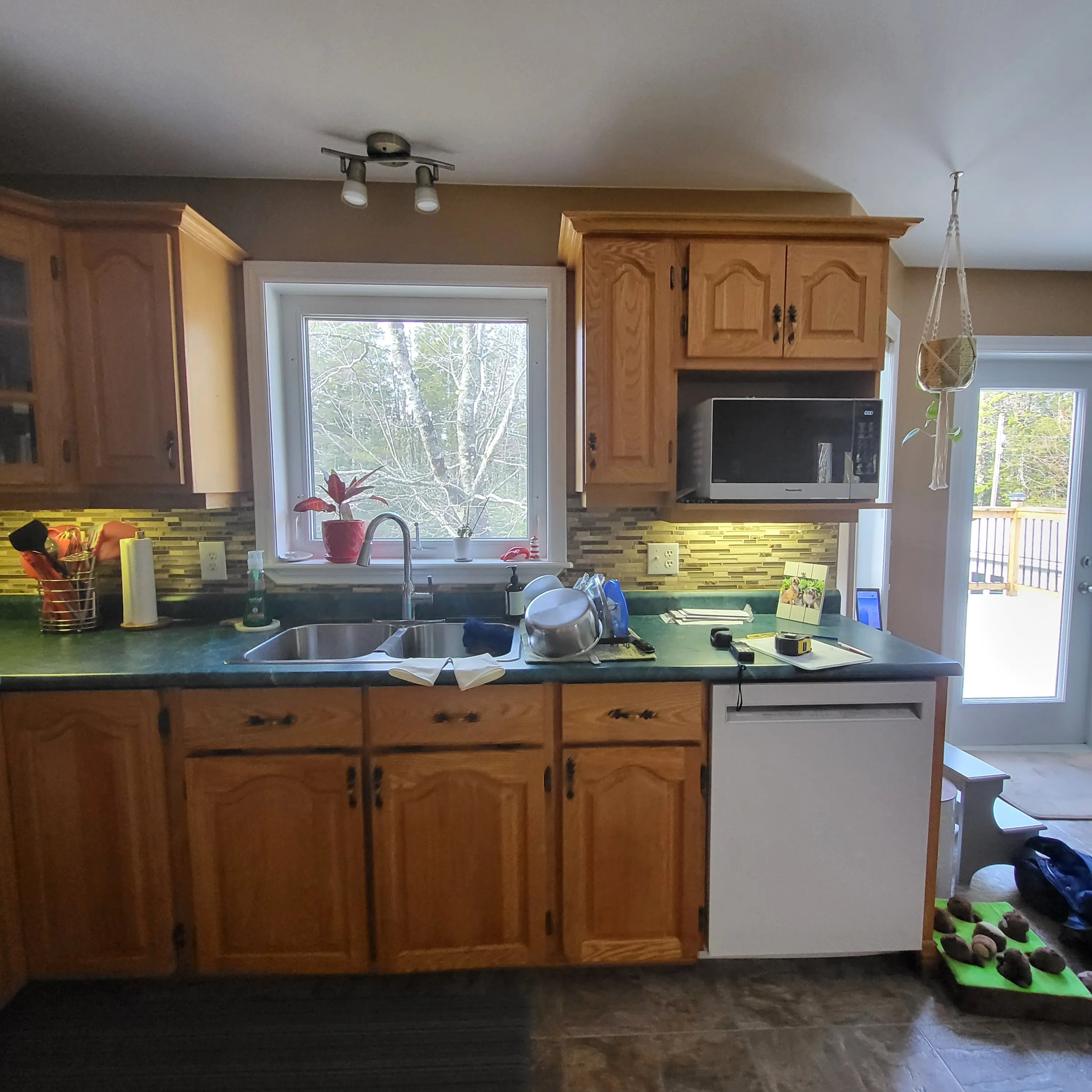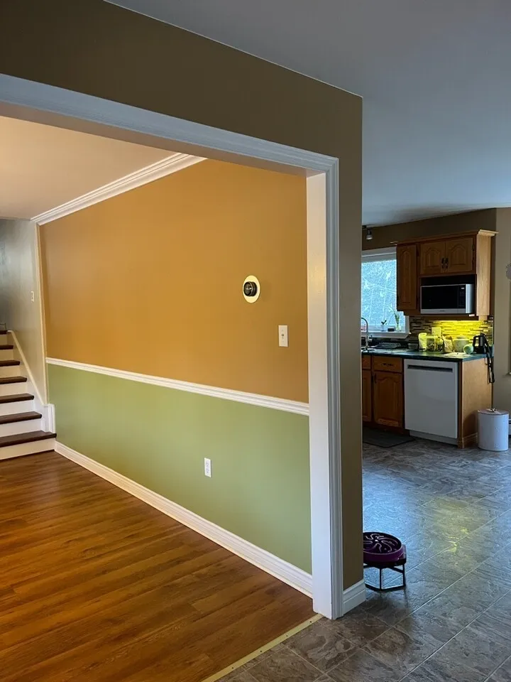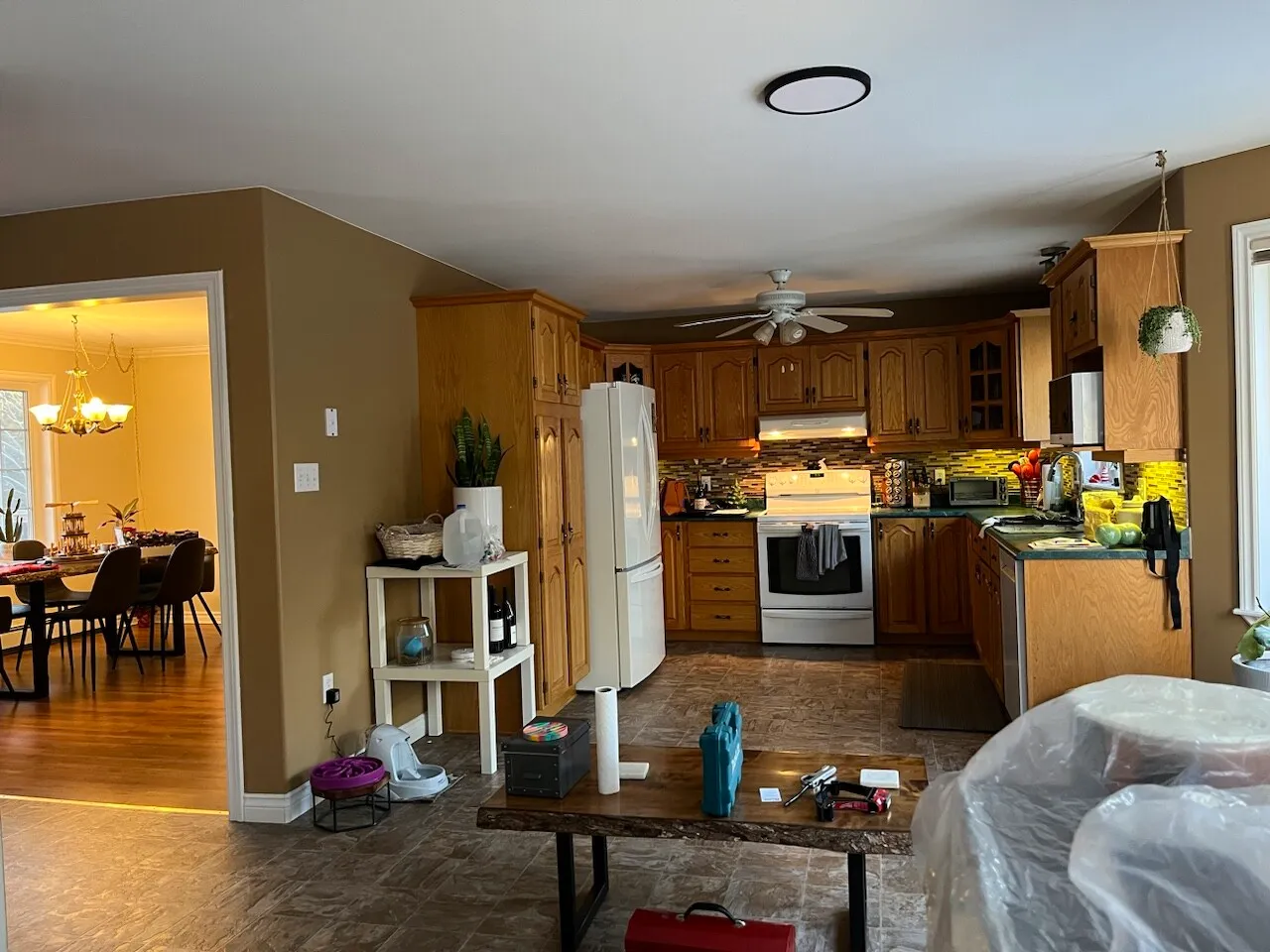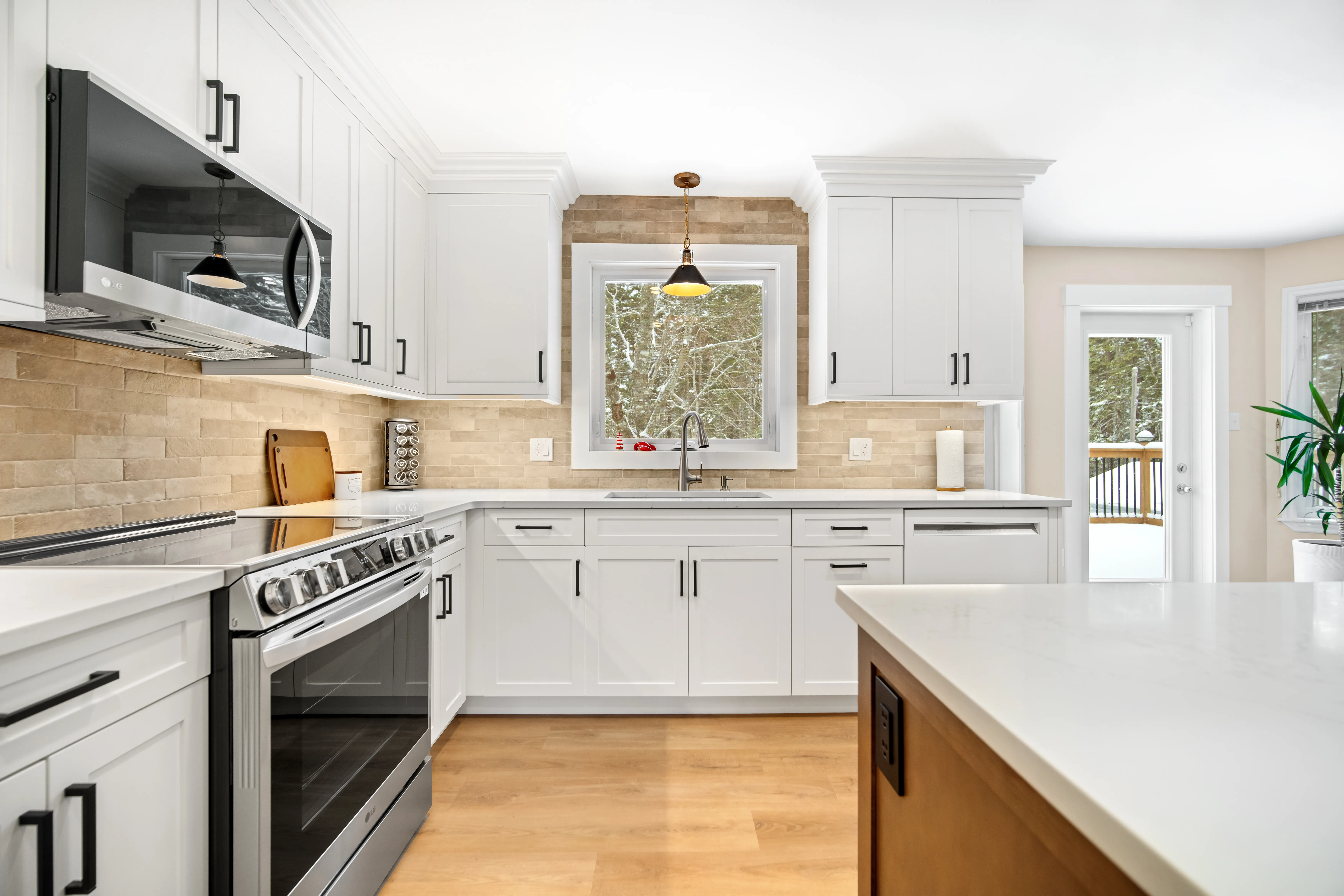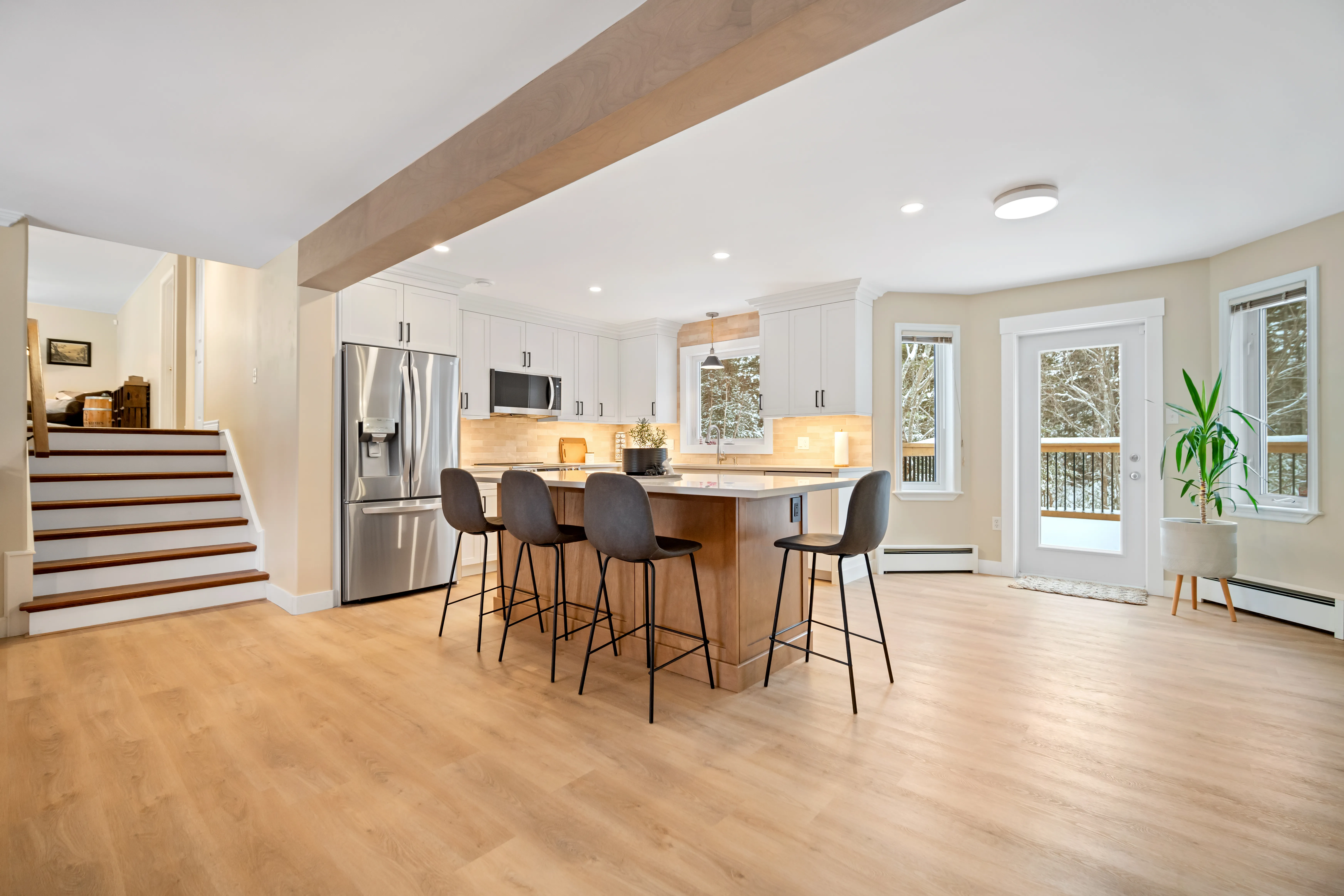 This project revitalized a home in Hammonds Plains, Nova Scotia, by transforming a dated kitchen and dining area into a bright, open, and highly functional space. The removal of a load-bearing wall dramatically altered the layout, creating a seamless flow between the kitchen and dining room. The relocation of the refrigerator to the back wall, along with the addition of a spacious island and a dedicated coffee bar, significantly enhanced the kitchen's usability. The homeowners now enjoy a modern kitchen featuring white shaker cabinets extending to the ceiling, quartz countertops, and a carefully designed lighting scheme. The transformation is striking, moving from a compartmentalized, dim space with honey-toned oak cabinets and a dark green laminate countertop to a light-filled, unified area.